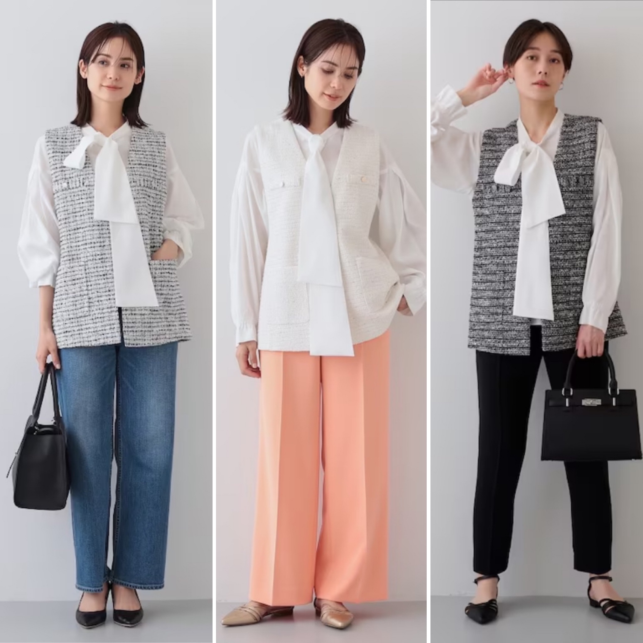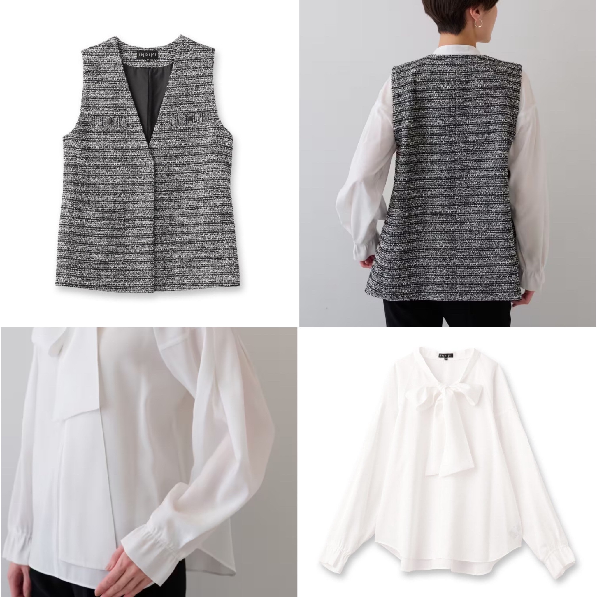 着映えするツイードジレとボウタイブラウスがセットになったINDIVIならではのカセット服です。